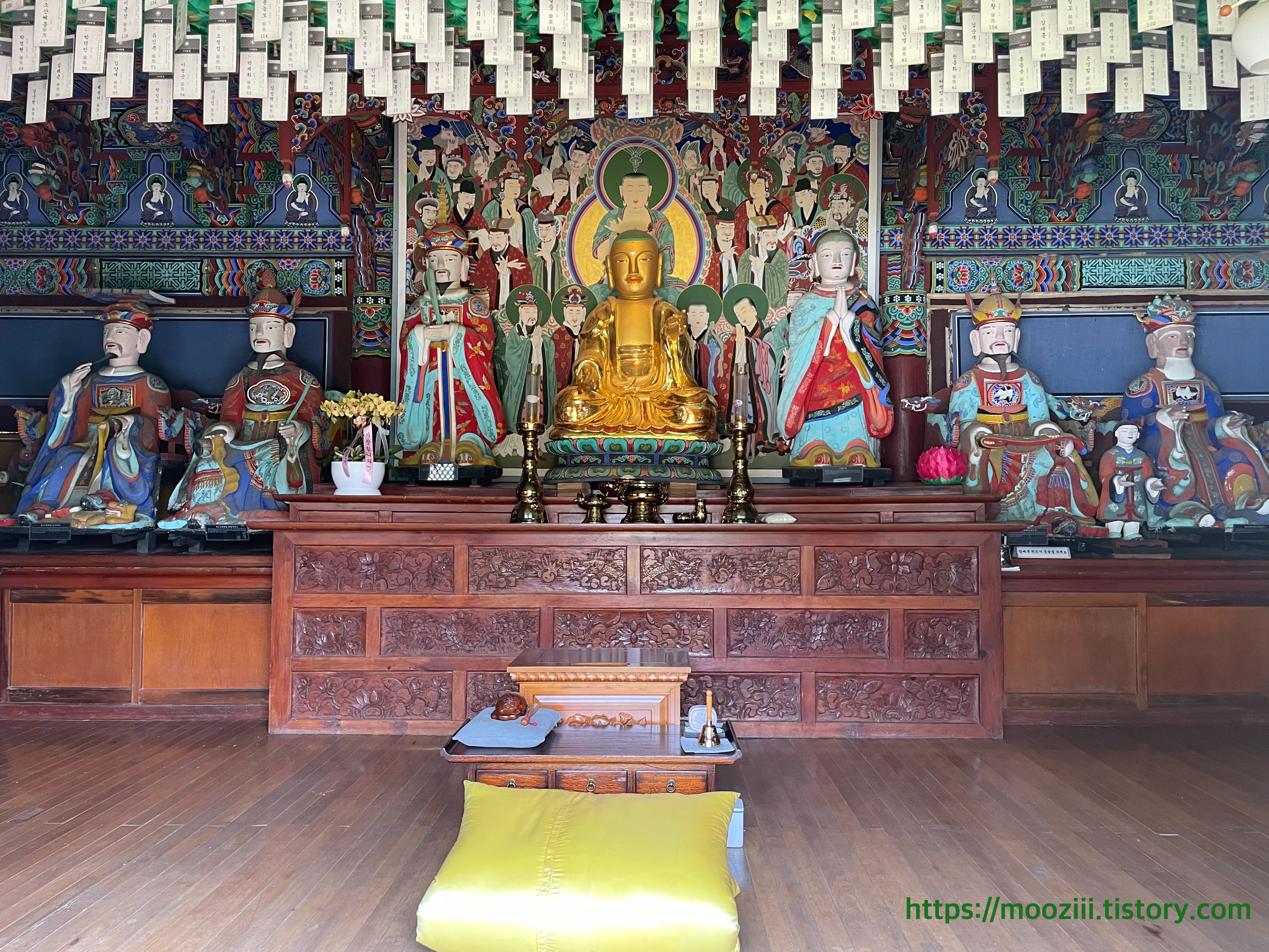 건물은 전면 5칸, 측면 3칸의 맞배지붕 형태이고, 기둥 위와 사이에도 공포를 배치한 다포 양식으로 꾸며져 있습니다. 내부에는 석가여래, 약사여래, 아미타여래 세 불상이 모셔져 있고, 그 뒤에는 영조 17년(1741)에 제작된 탱화도 있어 조선시대의 불교미술도 함께 엿볼 수 있었습니다.