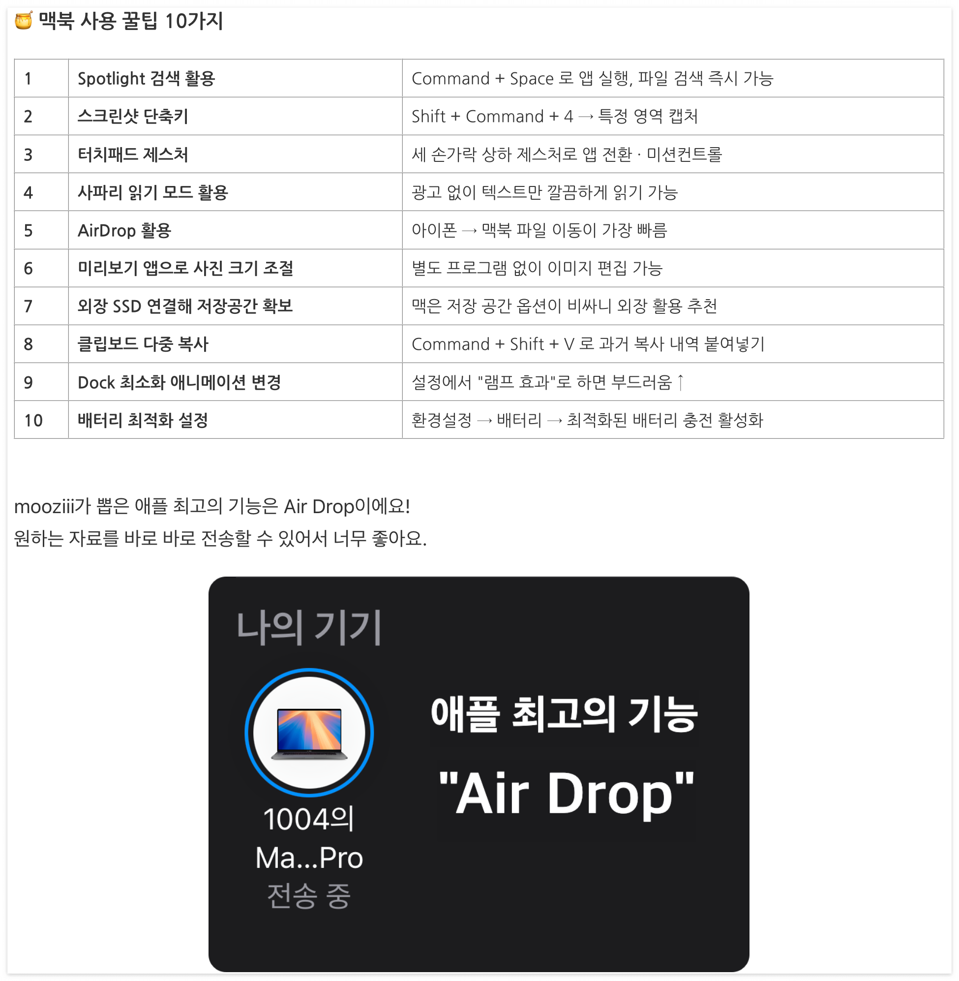 | 5 | AirDrop 활용 | 아이폰 → 맥북 파일 이동이 가장 빠름 |