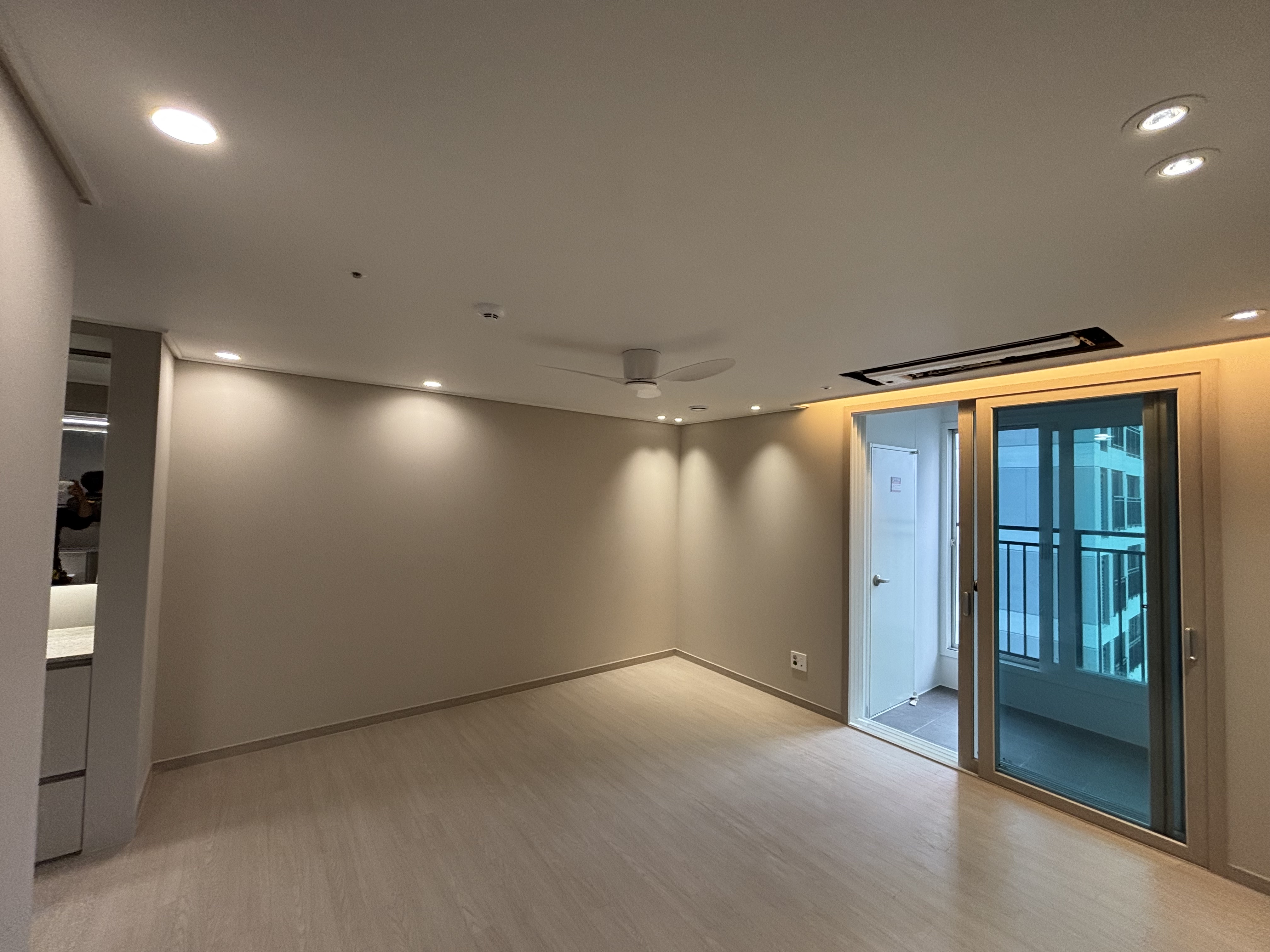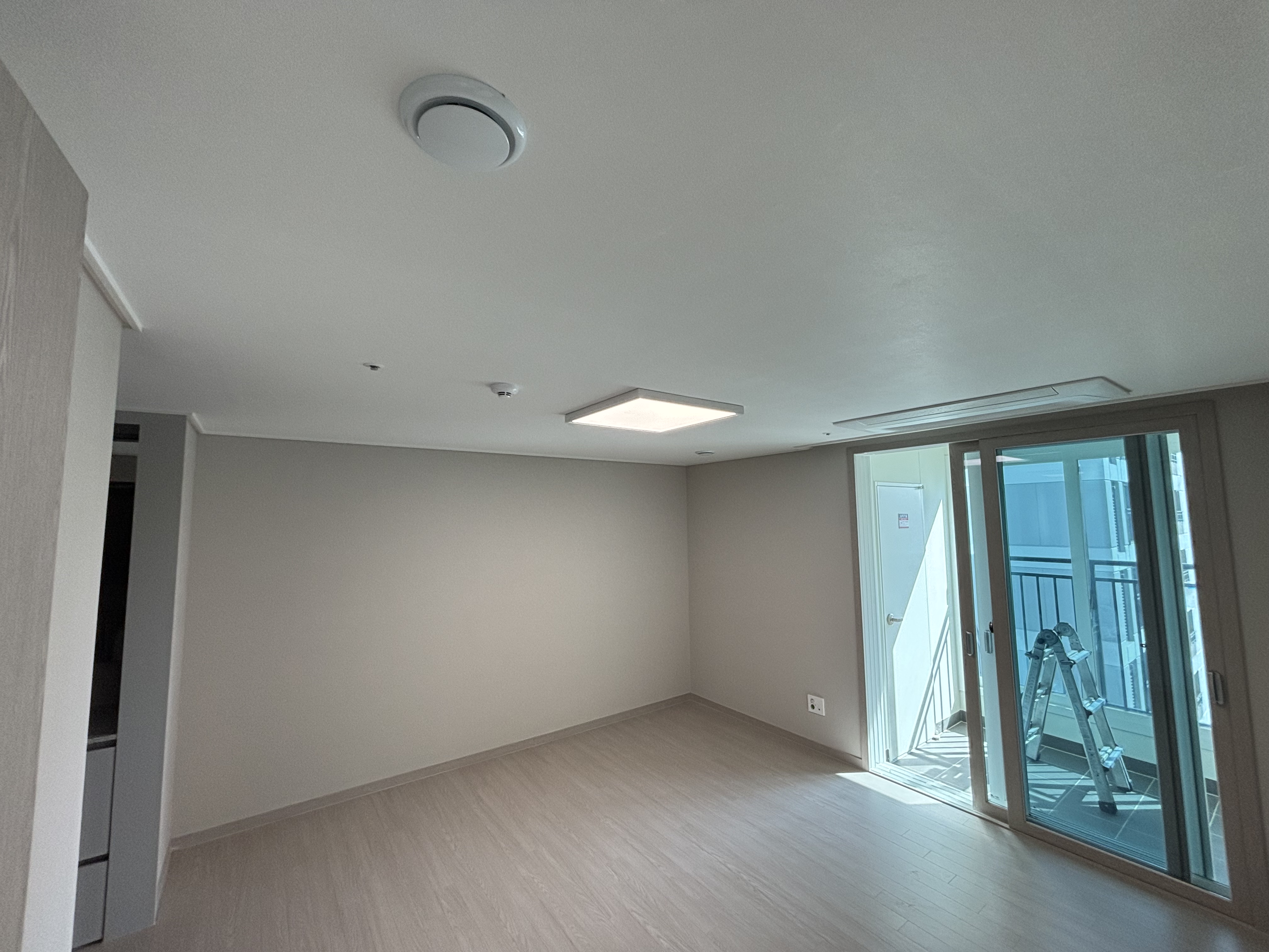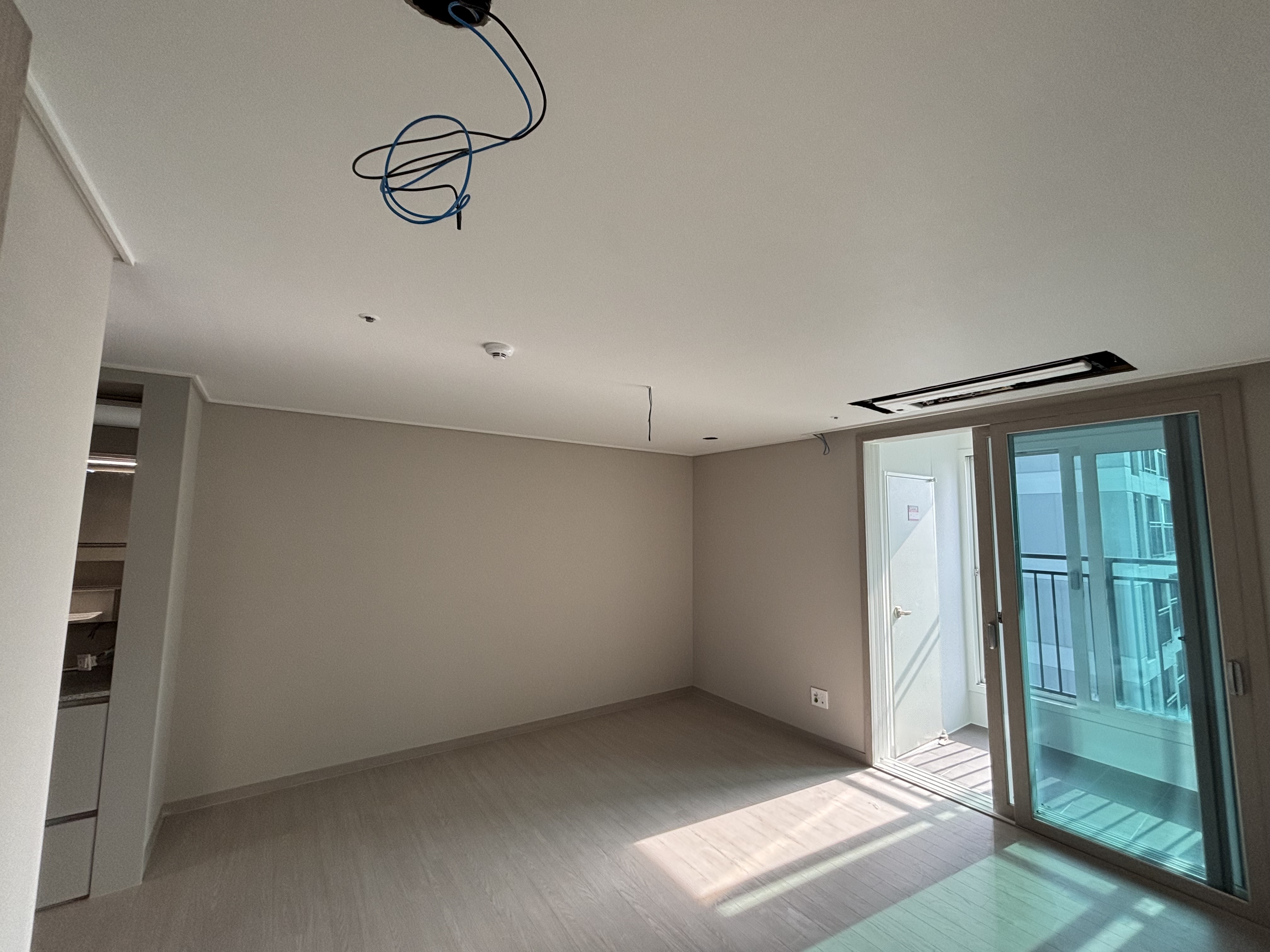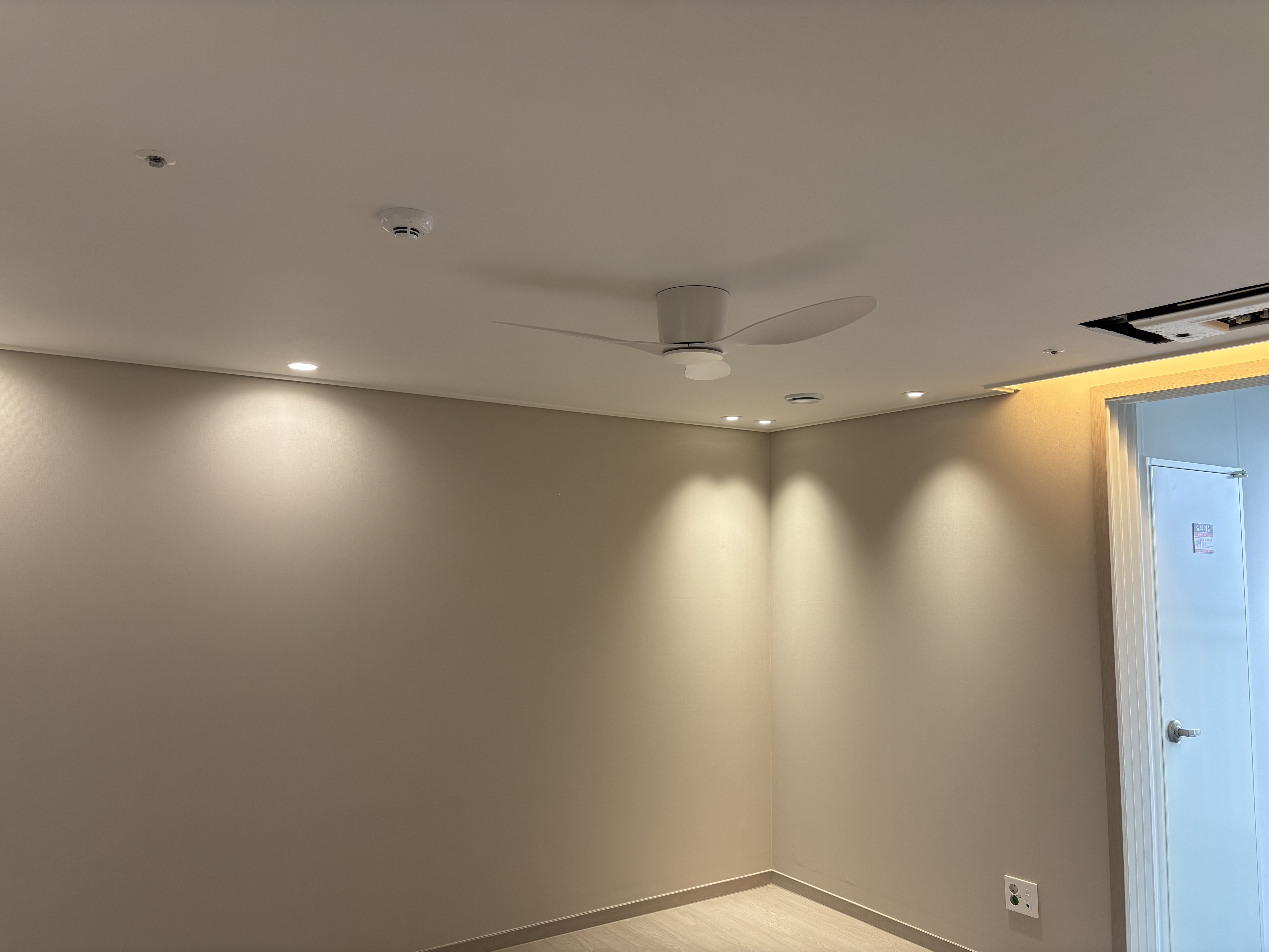 우선 기존에 설치되었던 전등은 모두 철거했고요. 기존에 전등이 설치되었는 부분은 실링팬을 설치할 계획이어서 도배를 했어요 팁을 드리자면, 새 아파트를 입주하는 시기에는 하자를 보수하는 도배팀이 상주하고 있어서 평소보다 저렴한 금액으로 도배를 받을 수 있어요.