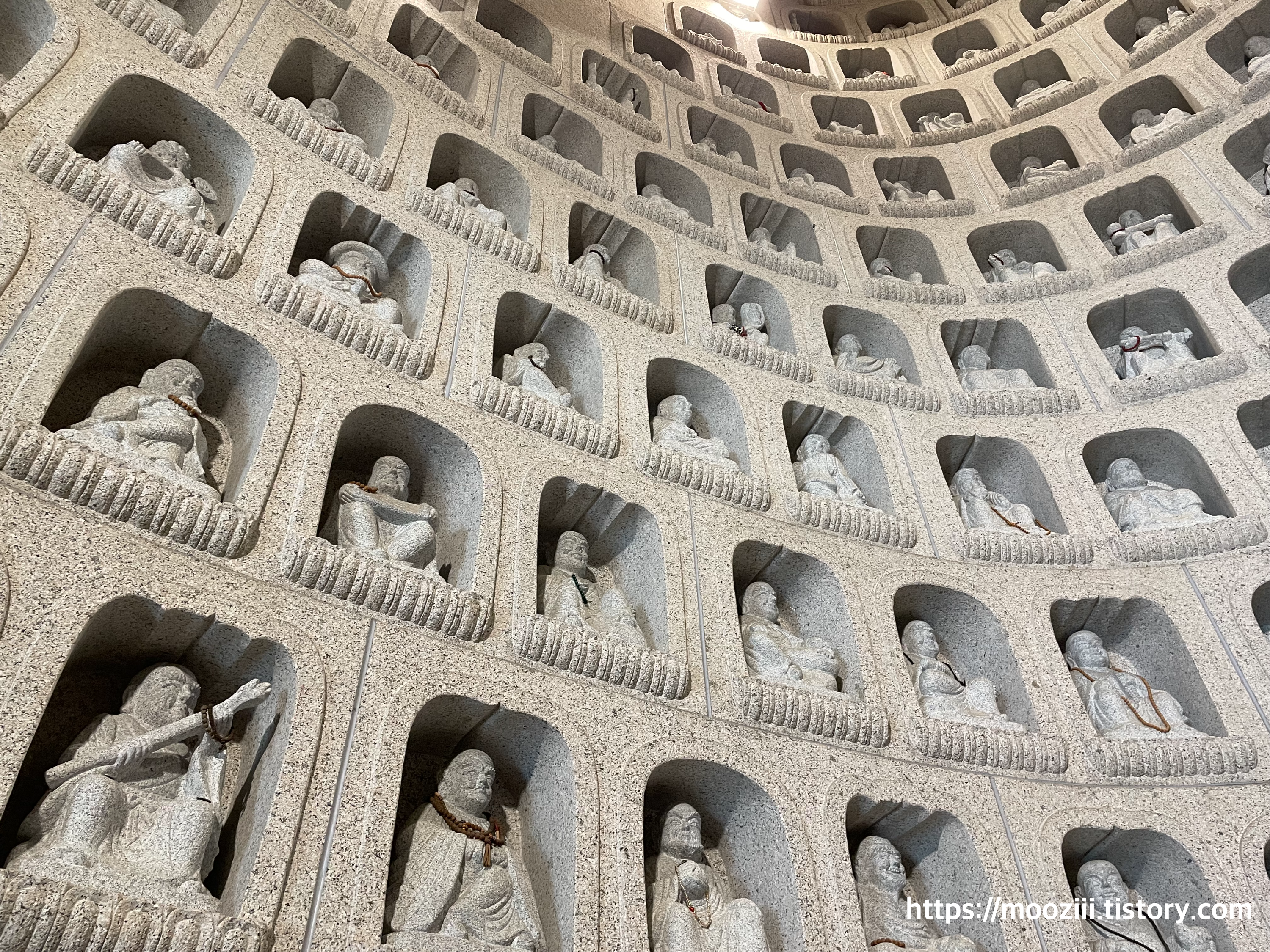 암반을 파서 만든 석굴 내부에 수많은 나한상(석불)이 벽면을 따라 봉안되어 있어요.