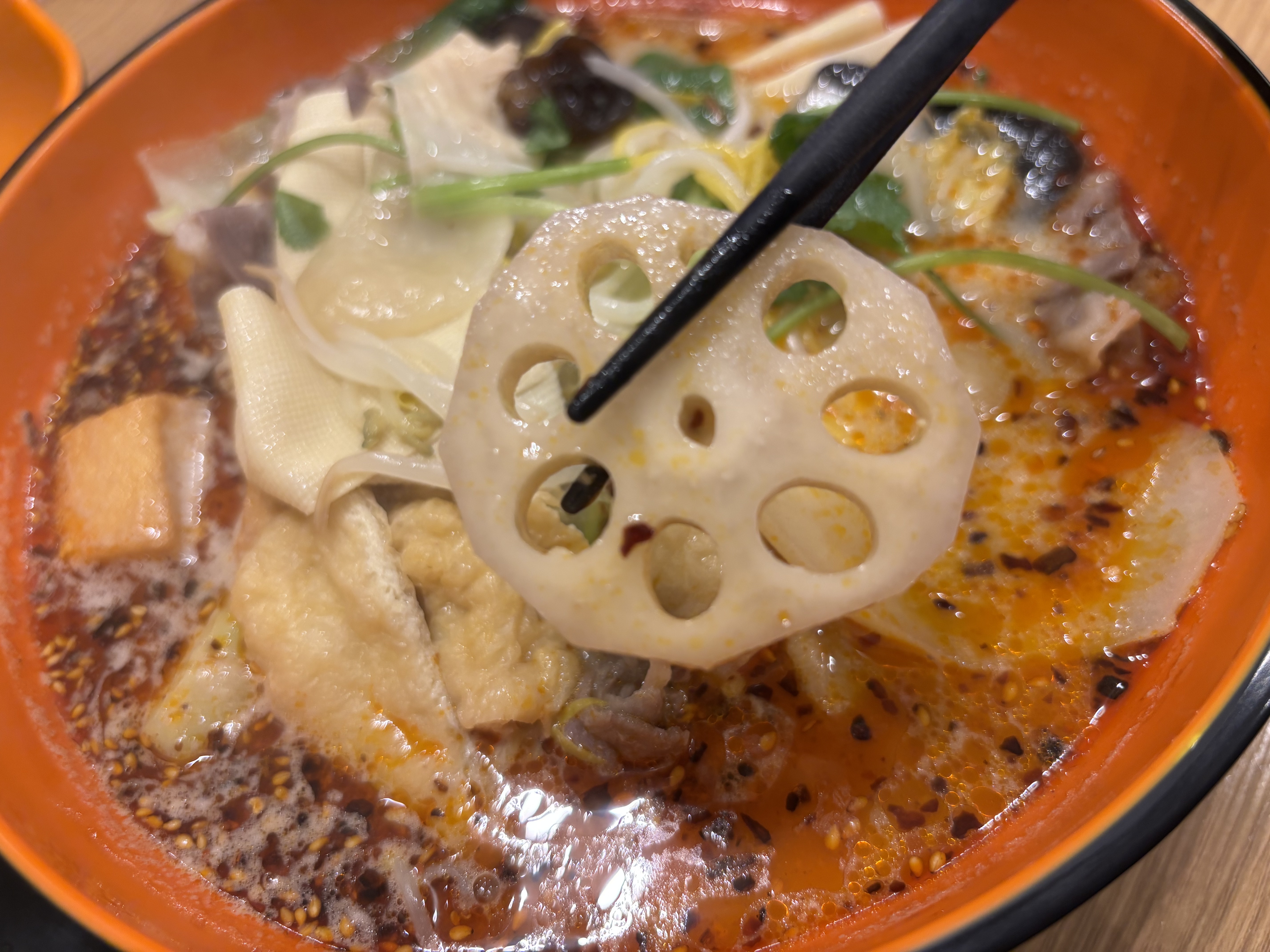 드디어 주문한 마라탕이 나왔습니다! 주황색 그릇 한가득 제가 고른 재료들이 잘 익혀져 나왔네요. 국물 한 입 딱 먹으면, 사골 육수의 진한 맛과 마라 특유의 알싸함이 입안 가득 퍼집니다.