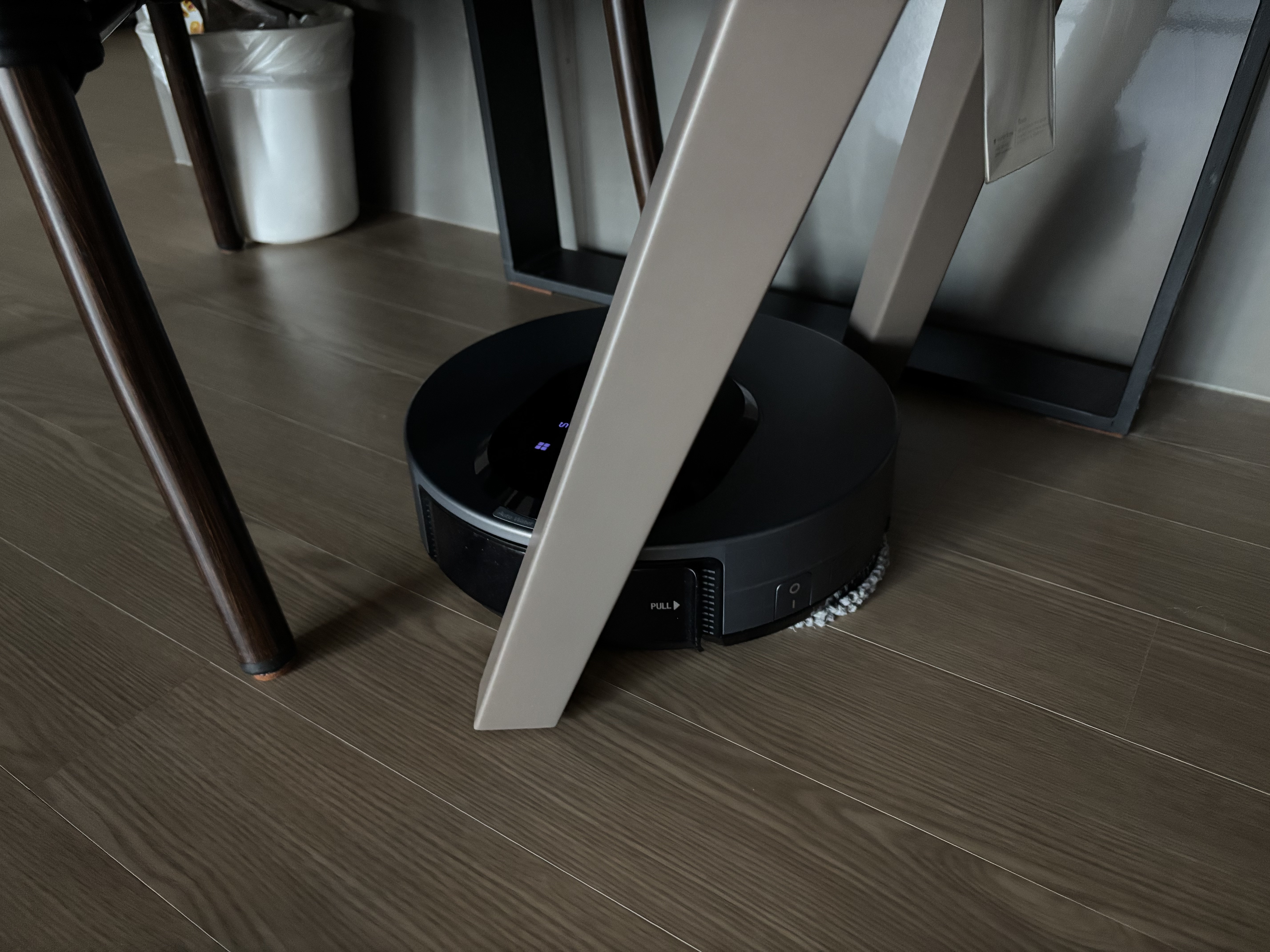 장애물 회피 능력도 상당히 좋습니다. 위 사진처럼 식탁 의자 다리가 복잡하게 있는 공간에서도 갇히지 않고 요리조리 잘 빠져나와 꼼꼼히 닦아주는 것을 볼 수 있습니다. ToF 센서 등이 내장되어 있어 공간 인지 능력이 뛰어나다는 것이 체감됩니다.
