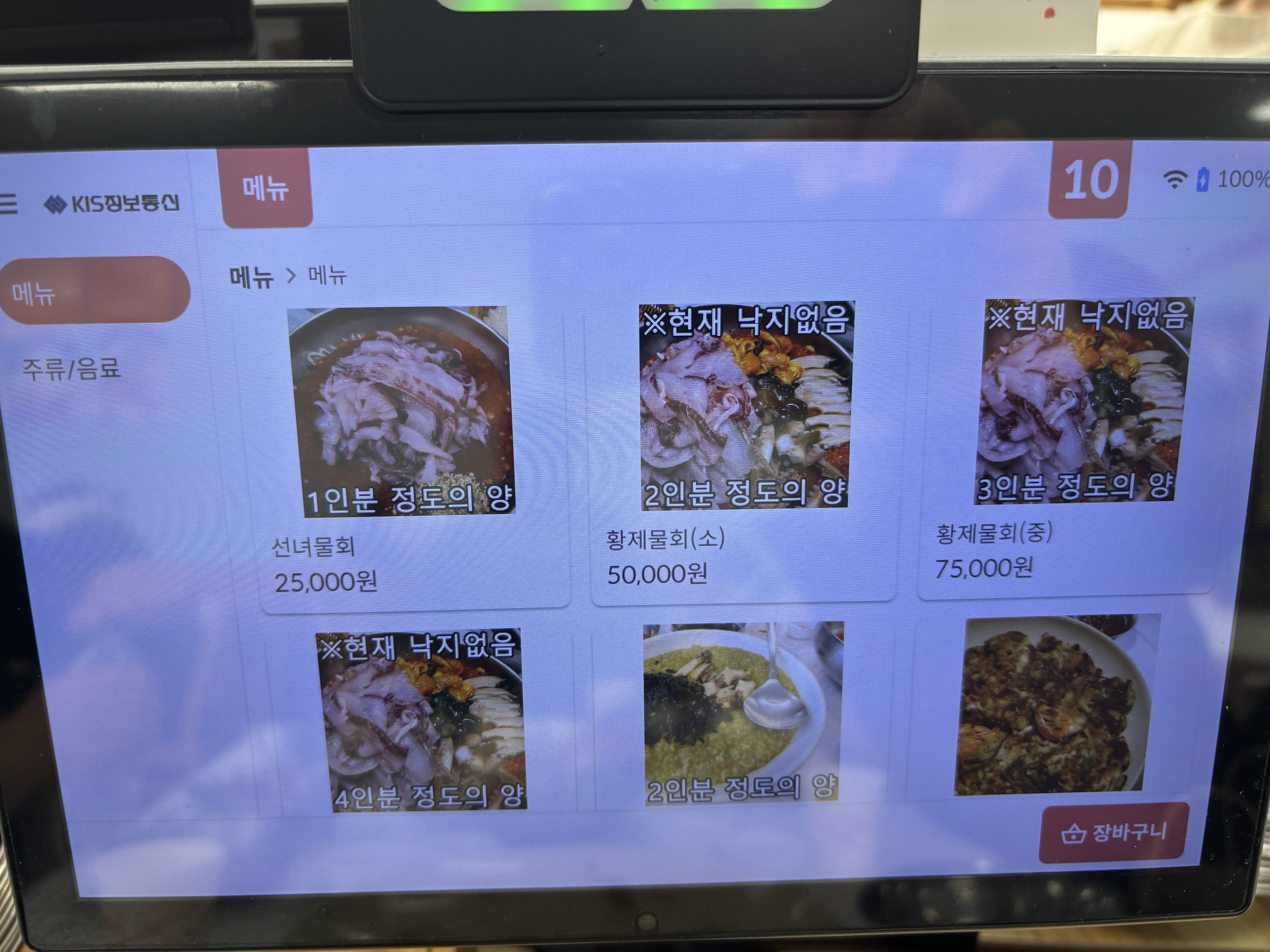 | 황제물회 (중) | 3인분 / 제일 많이 시킴 | 75,000원 |