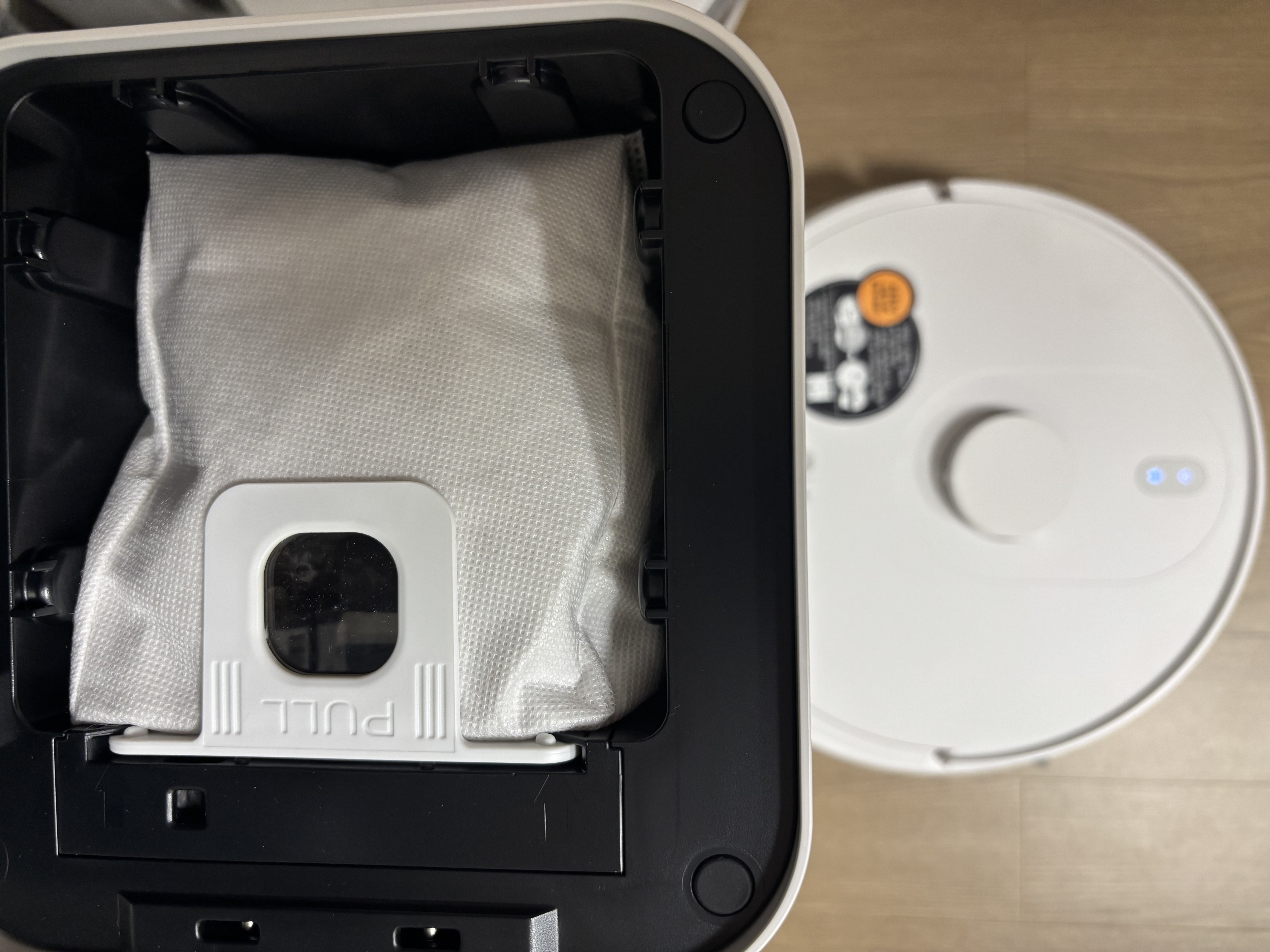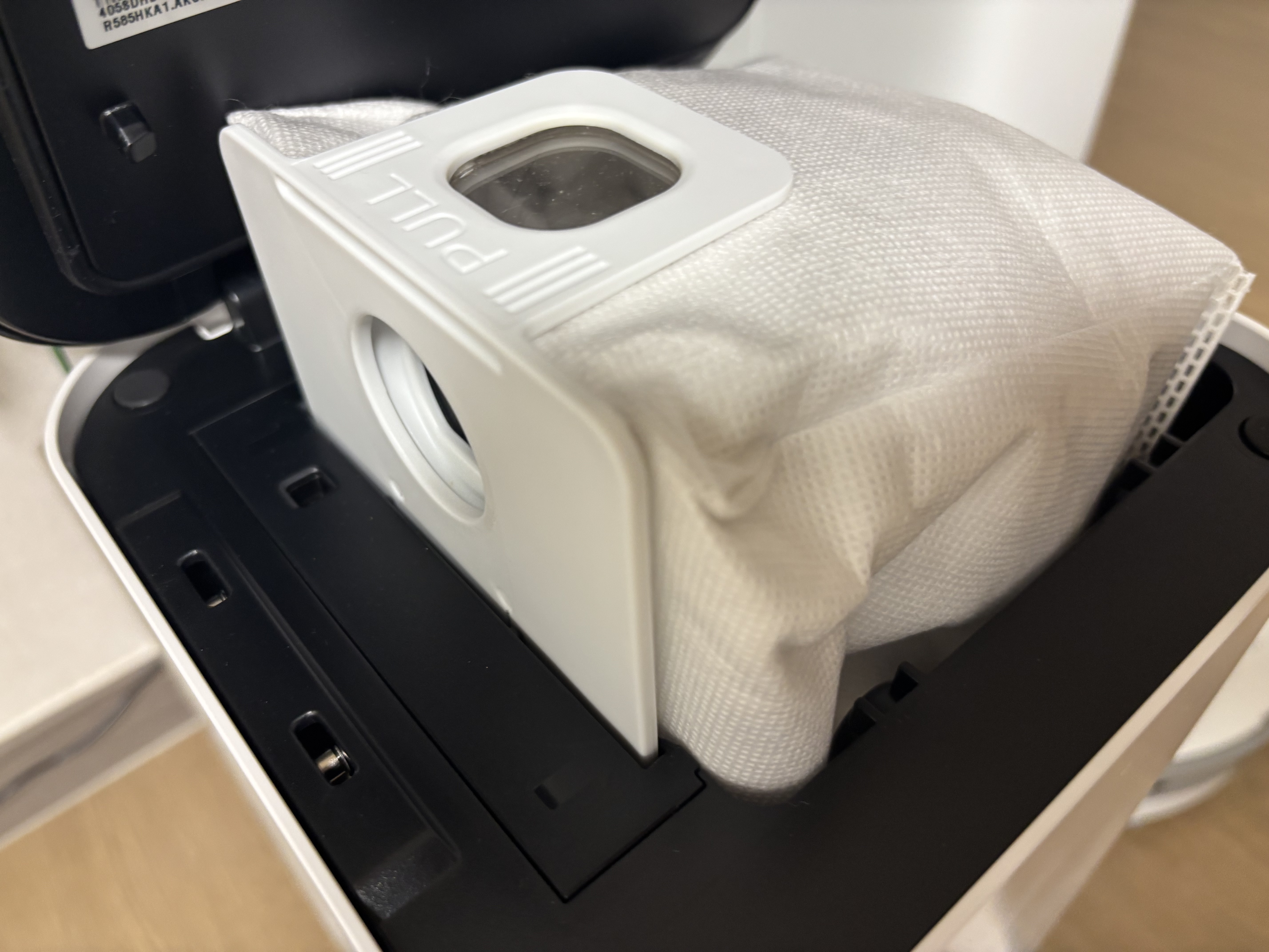 사용하던 먼지봉투가 빵빵하게 부풀어 오른 게 보이시나요? 교체 시기가 지나면 먼지 흡입력이 떨어지거나, 스테이션 내부에서 쾌쾌한 냄새가 날 수 있으니 1~2개월에 한 번씩 체크해 주는 것이 위생상 좋습니다.
