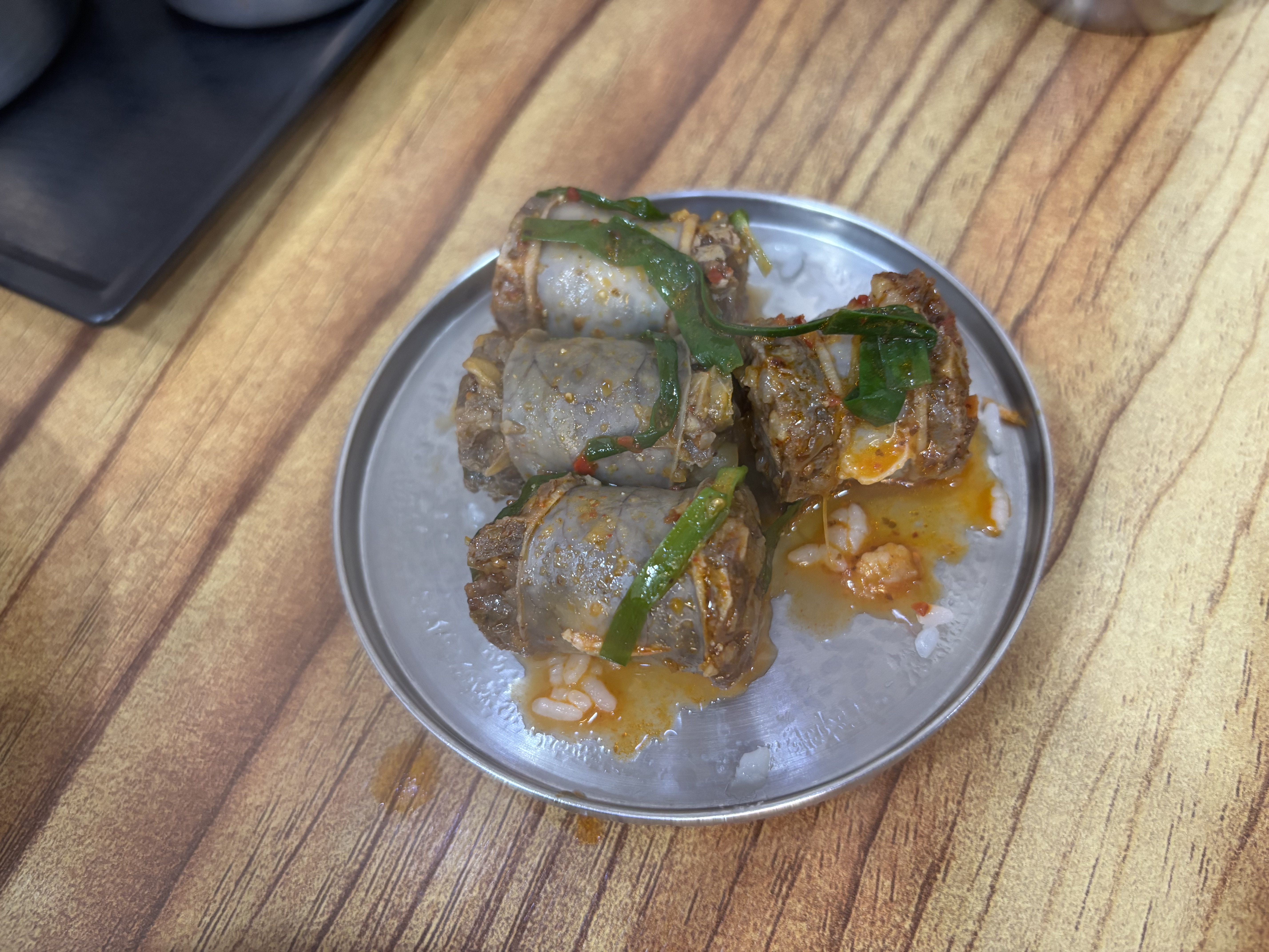 오늘의 하이라이트는 단연 얼큰순대국이었습니다! 맵기는 신라면 정도라 딱 기분 좋게 칼칼한 수준이었어요. 무엇보다 국물 맛이 일반적인 다대기를 푼 맛이 아니라, 진한 육개장 국물 같은 묵직함이 느껴져서 정말 좋았습니다. 부추와 고기가 어우러져 해장으로도, 안주로도 최고일 것 같아요.
