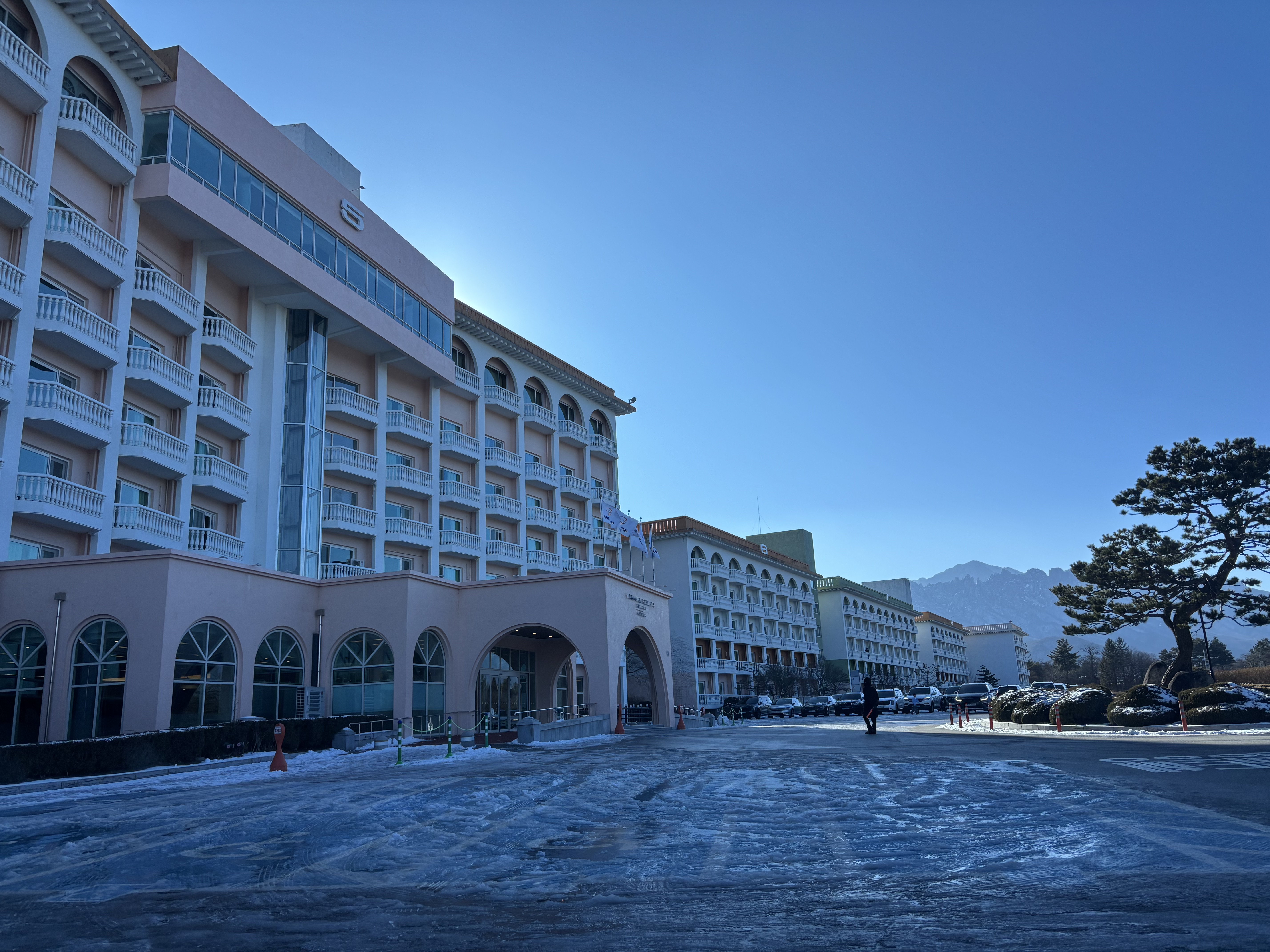 푸른 하늘과 웅장한 설악산 뷰가 예술이었던 속초 한화리조트 별관의 외관입니다. 겨울의 쨍한 날씨와 이국적인 리조트 건물이 너무 잘 어울리죠? 여행의 피로를 풀기 위해 리조트 내에 있는 워터피아 사우나를 방문했어요.
