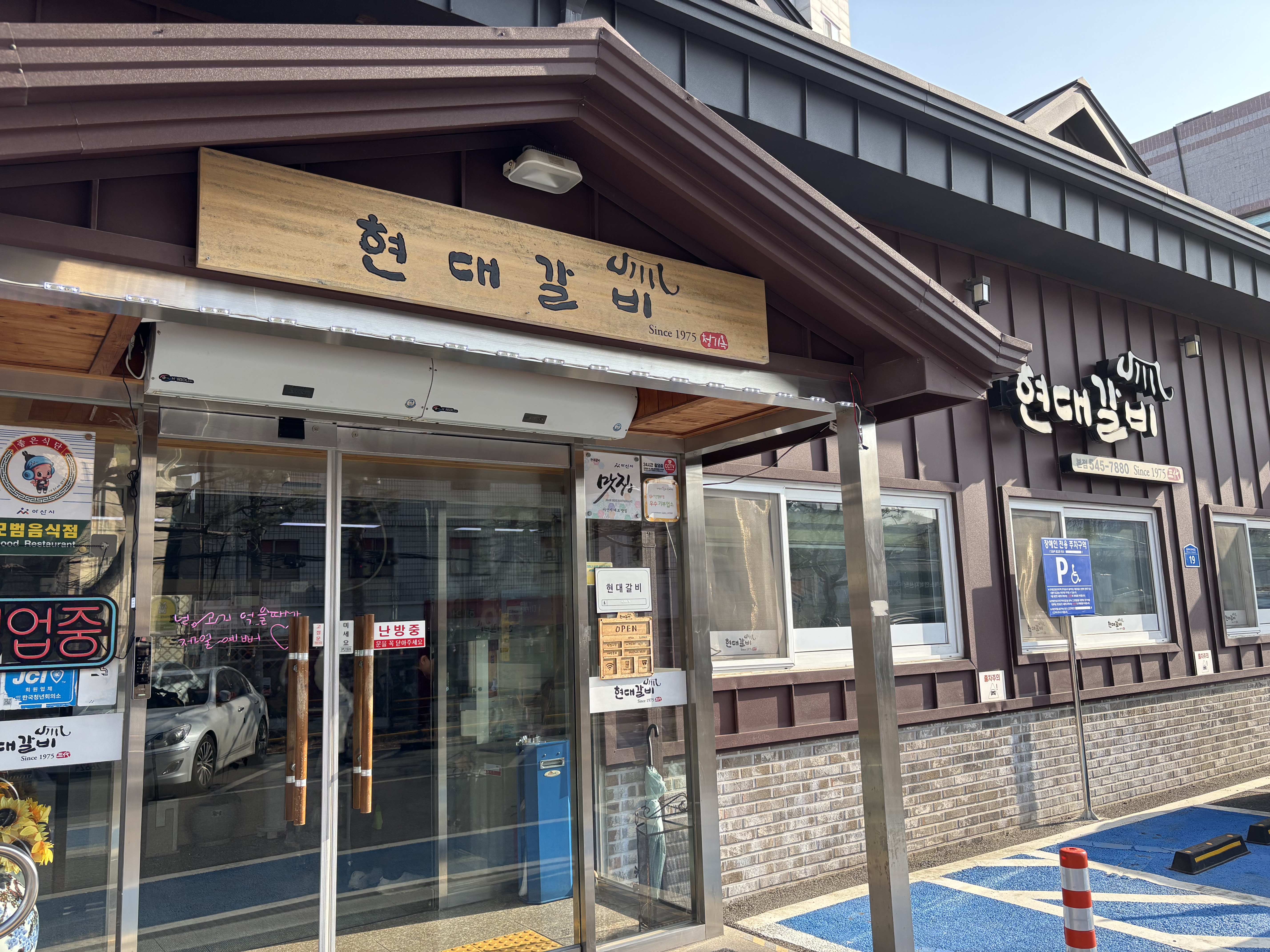 현대갈비는 1975년에 개업하여 지금까지 그 명맥을 이어오고 있는 아산의 대표적인 식당입니다. 식당 입구 현판에서부터 오랜 세월의 흔적과 자부심이 느껴집니다.